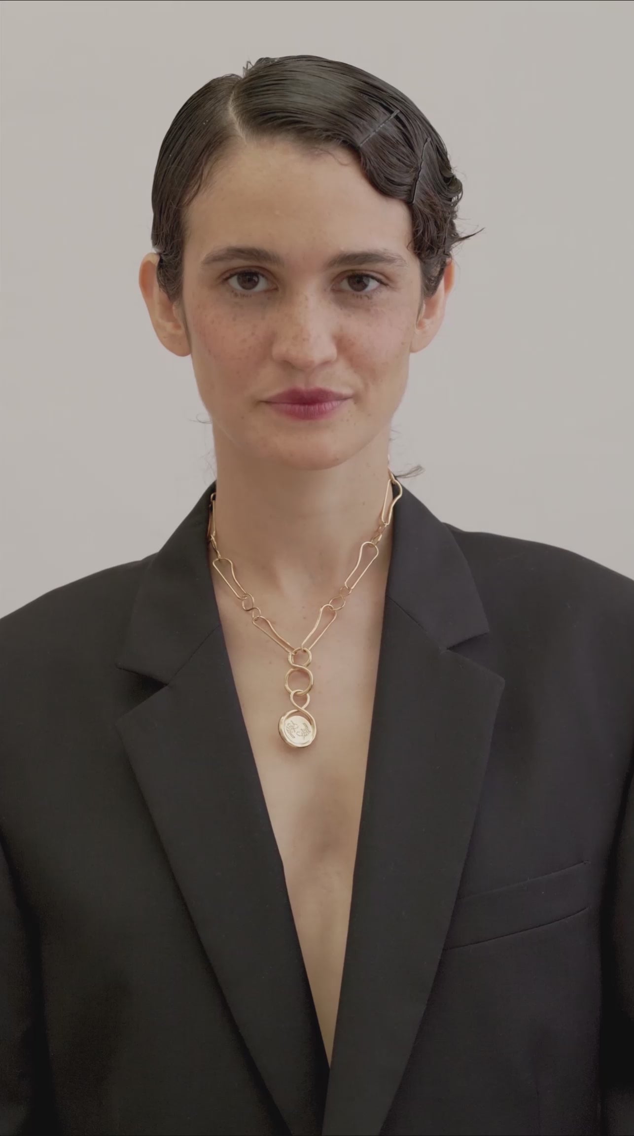 « Je voulais redéfinir le fermoir, qu’il soit beau, symbolique, qu’on puisse le porter sur le devant plutôt que sur le dos comme de coutume. Je voulais qu’il soit le lien de tous nos modèles. Qu’il ait cette fonctionnalité de pouvoir clipser des pendentifs ou médailles astrologiques et cette transformabilité puisqu’on peut clipser par exemple 2 colliers ensemble pour créer un nouveau sautoir»