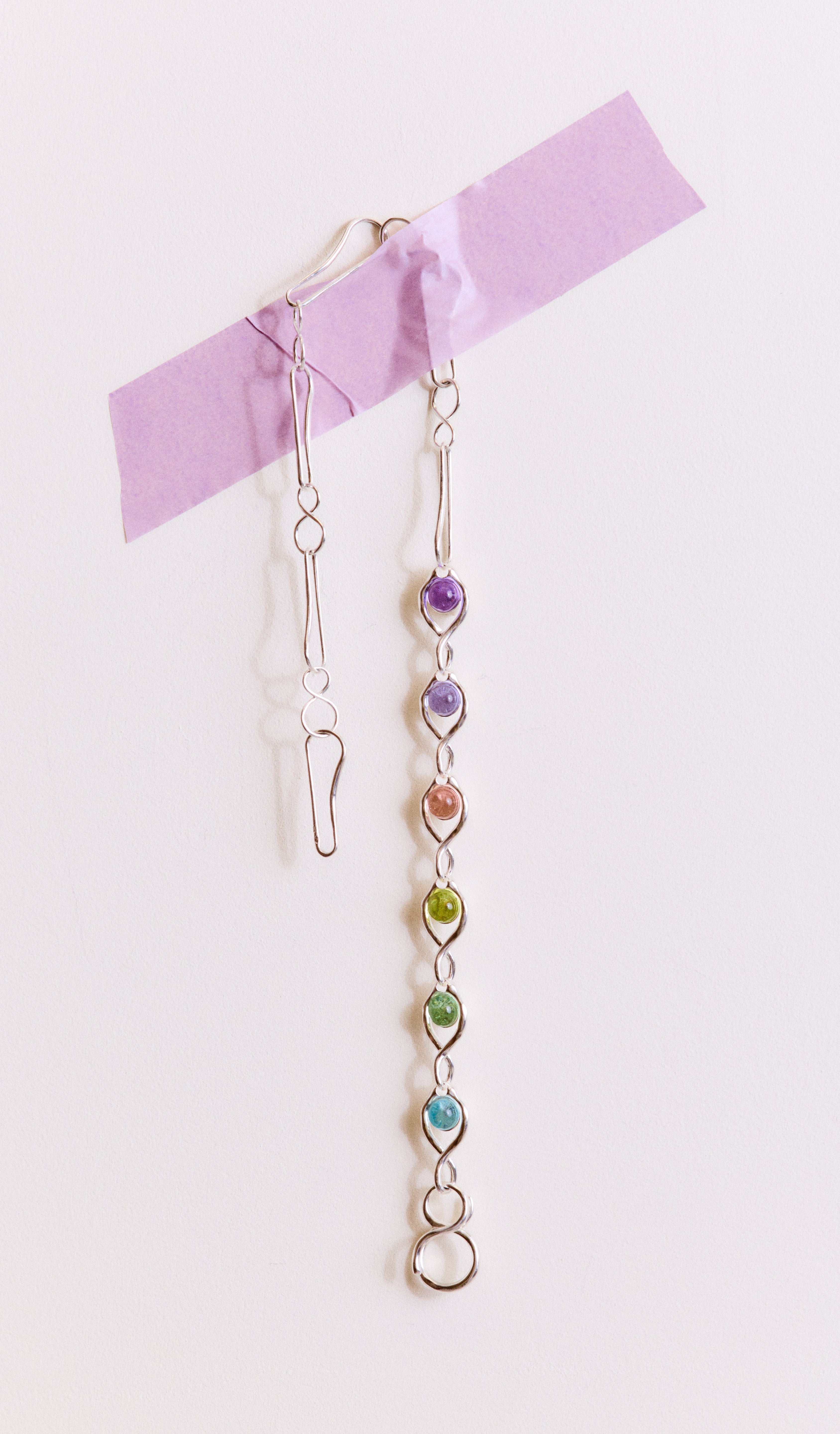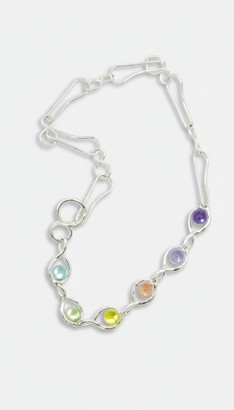 Une rangée de 6 modules de sertis entrelacés de perles en verre de Murano fabriquées dans la Drôme. Chaque perle en verre est fabriquée de manière artisanale et fait toute sa singularité. chacune présente des inclusions dans le verre et des formes légèrement irrégulières.