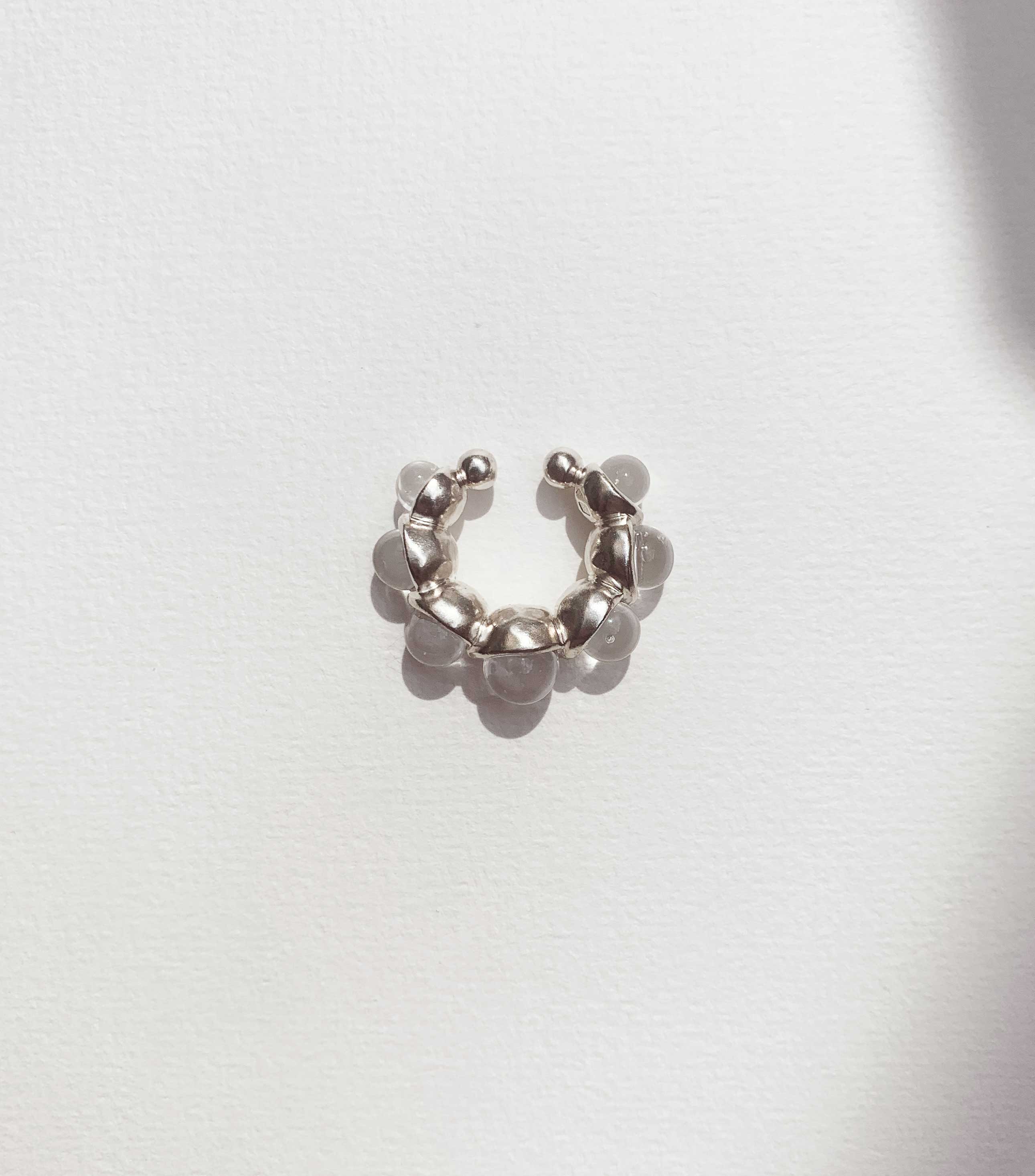 Le EARCUFF GALACTIQUE a des sertis entrelacés en taille dégradée de perles en verre de Murano, fabriquées dans la Drôme. Chaque perle en verre est fabriquée de manière artisanale et fait toute sa singularité. Chacune présente des inclusions dans le verre et des formes légèrement irrégulières.