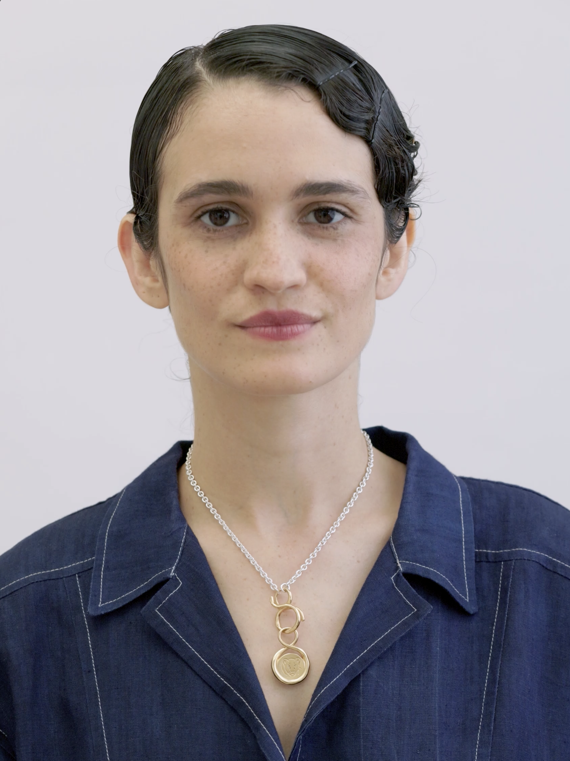 The medallions of the ASTRES collection were designed with the image of characters, animals or feminine objects. This lion medallion, whose design is a lioness without a mane, has a large bail that allows it to be passed on a personal chain.